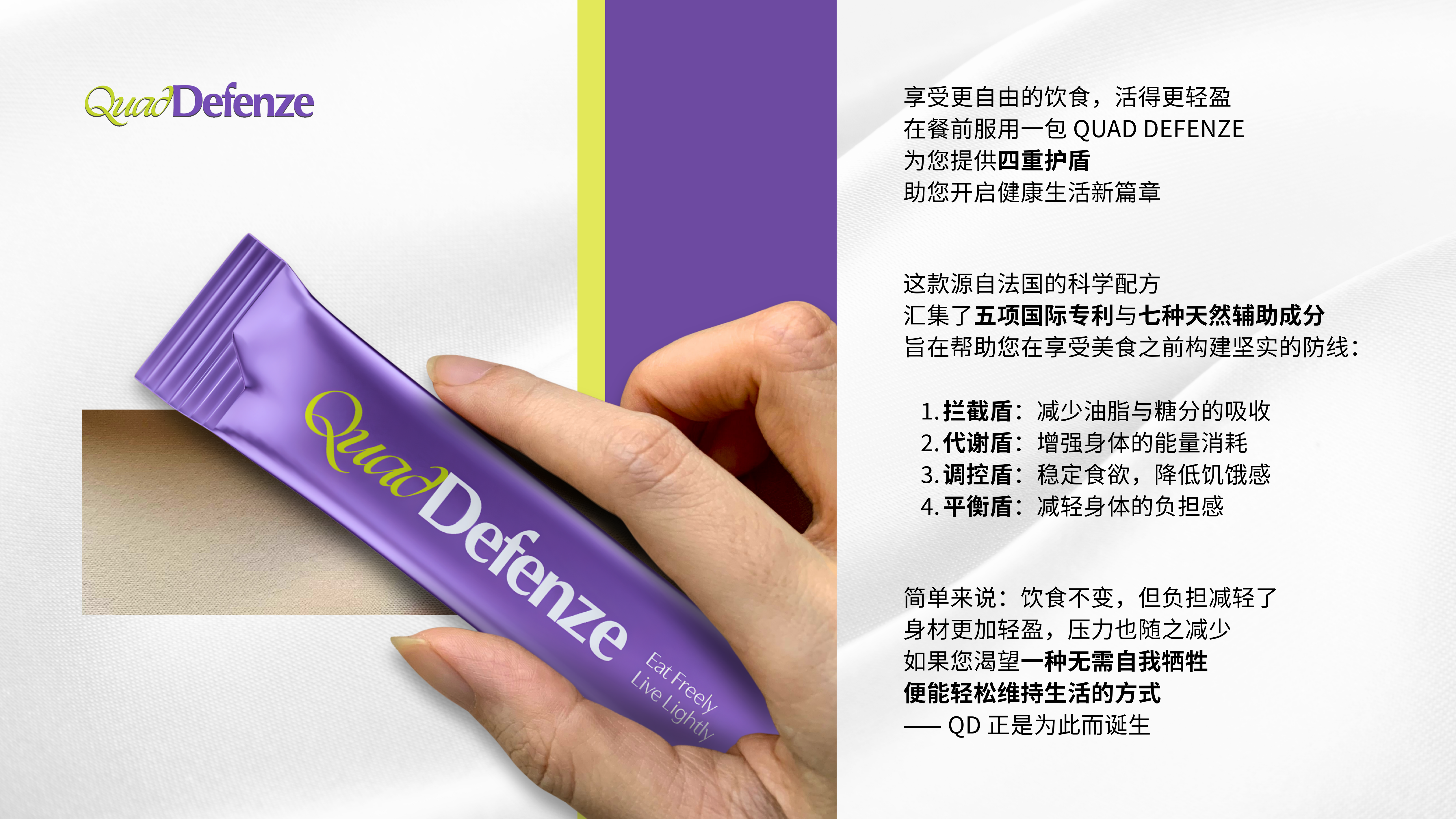 QUAD DEFENZE,一款让你重获饮食主导权的创新产品。它不是单纯地阻止你吃,而是让你主动掌控身体的吸收与代谢。
